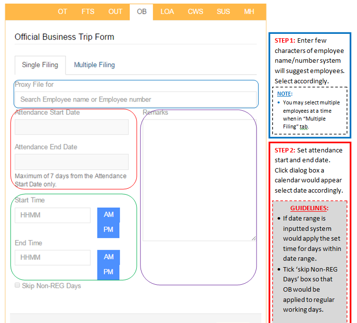 Description: Proxy Filing is the activity of filing attendance exception forms in behalf of employees. Self-service is encouraged and preferred however, in case of exception and need proxy filing feature is made available.